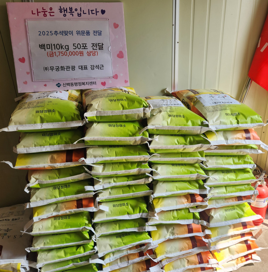 ㈜무궁화관광(대표 강석근)은 지난 1일 신백동행정복지센터를 방문해 관내 독거노인 및 저소득 취약계층을 위해 백미(10㎏) 50포를 기탁했다.